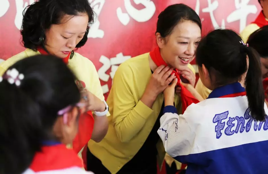 學(xué)生們?yōu)槔蠋熡H手系上了紅領(lǐng)巾,表達(dá)對(duì)老師諄諄教誨的感激之情。