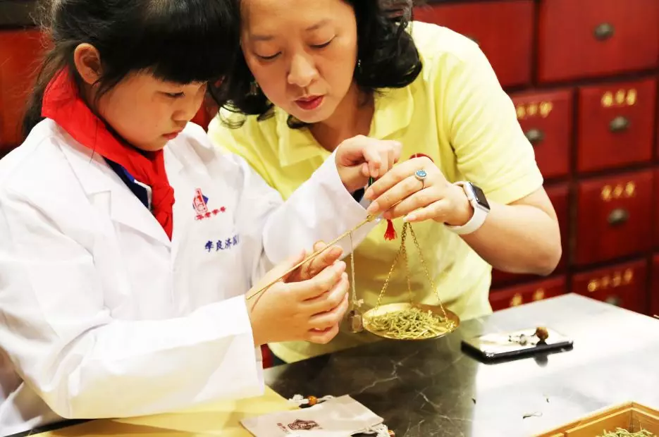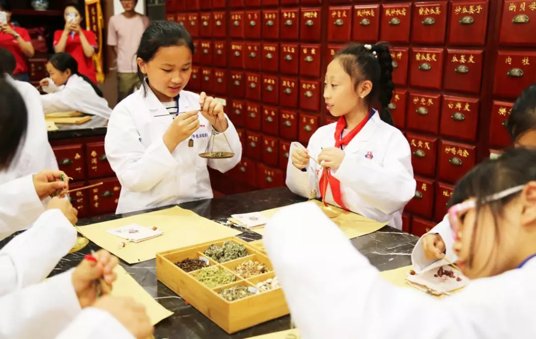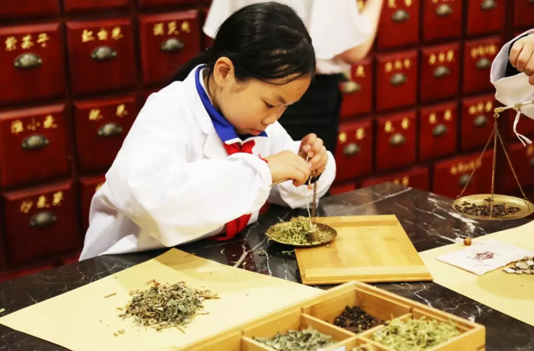 緊接著,學(xué)生們換上“白大褂”,開始了“小小中藥師”的體驗(yàn)活動(dòng)。