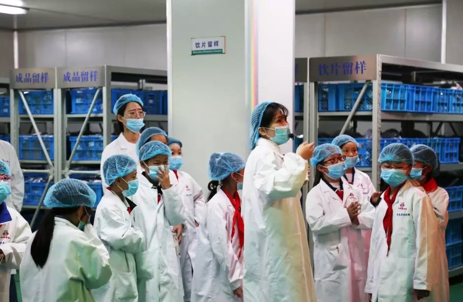 隨后,學(xué)生們來到了煎制服務(wù)中心。由于煎制服務(wù)中心要確保衛(wèi)生無污染,所以進(jìn)入之前,學(xué)生們戴上了一次性的口罩、帽子和鞋套。