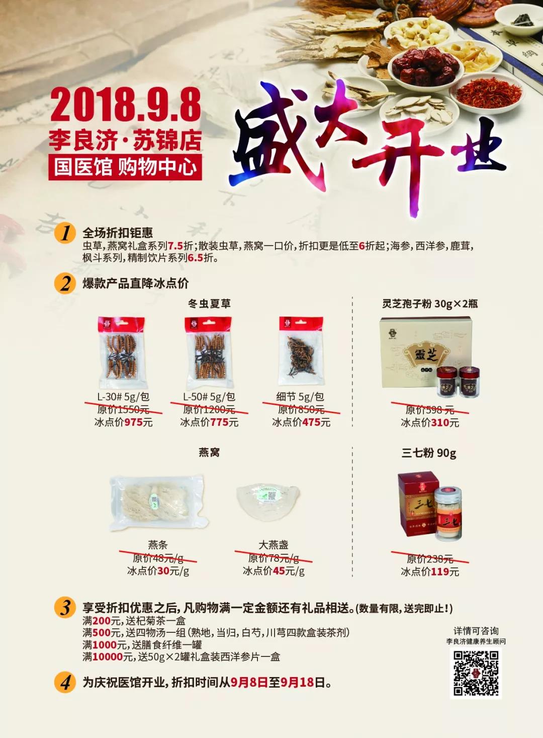 開業(yè)期間全場折扣鉅惠,蟲草、燕窩、三七粉、靈芝孢子粉等爆款產(chǎn)品直降冰點(diǎn)價(jià),購物還有更多好禮相送,期待您的光臨!